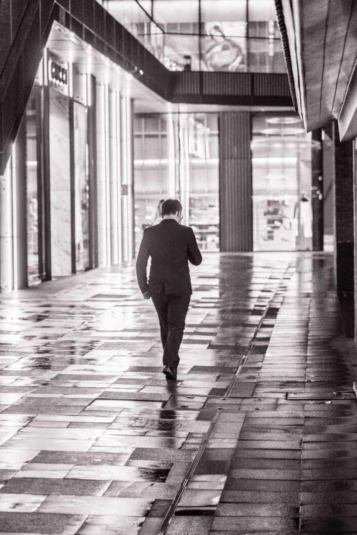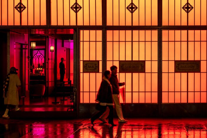 These photographs are not about landmarks or grand views. They are about atmosphere, weather, and everyday life unfolding quietly at night. Rain and mist blur the city’s edges, allowing small, ordinary moments to take center stage.