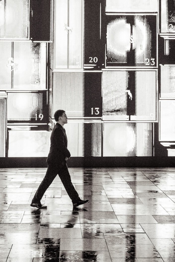 What interested me most was the contrast between movement and stillness. A man carrying a tire along Hongxing Road. A bicycle rickshaw waiting as pedestrians pass under umbrellas. Anonymous figures crossing light-filled spaces, briefly illuminated before dissolving back into the fog.