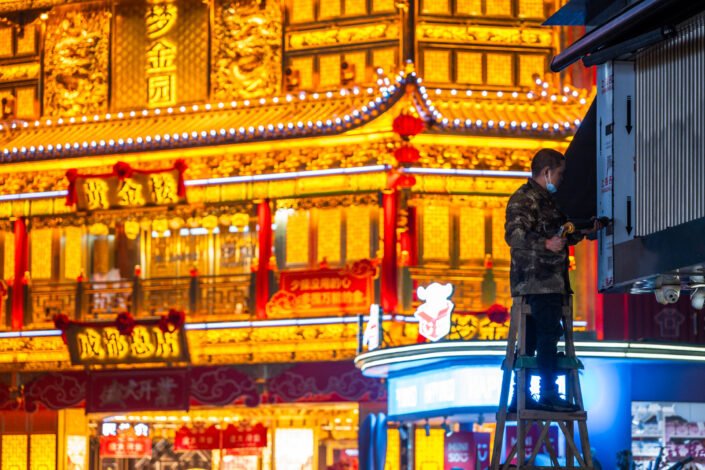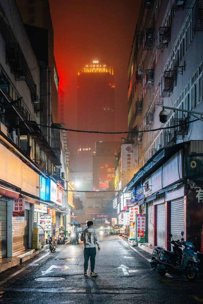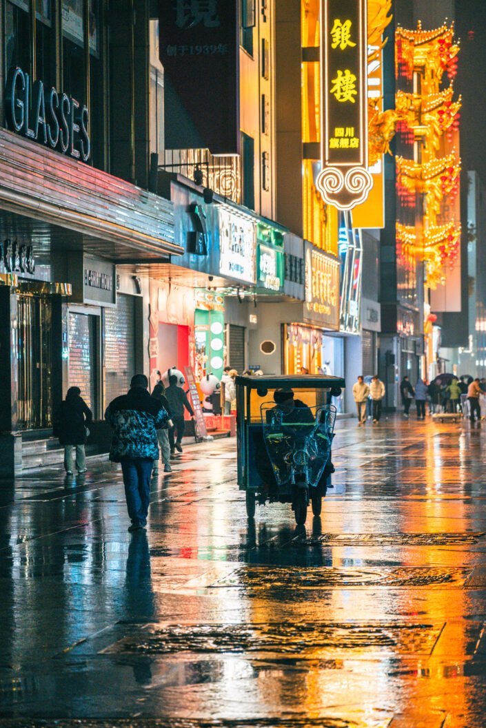 At night, Chengdu reveals another rhythm. Workers pause on ladders beneath glowing façades, maintaining the city while colorful lights pulse behind them. Businessmen walk alone along wet pavements, their reflections stretching across the ground. Narrow streets filled with signage disappear into mist, where shadows slide across rain-soaked concrete.