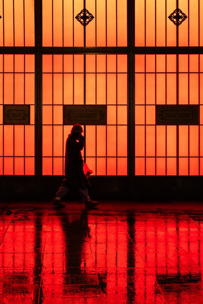 The rain amplified everything. Neon lights reflected endlessly on the pavement. Large windows bathed the streets in red, turning simple gestures—someone passing by, someone waiting—into fleeting visual moments. Even the busiest roads felt strangely calm, as cars moved slowly through the haze, towers barely visible in the distance.