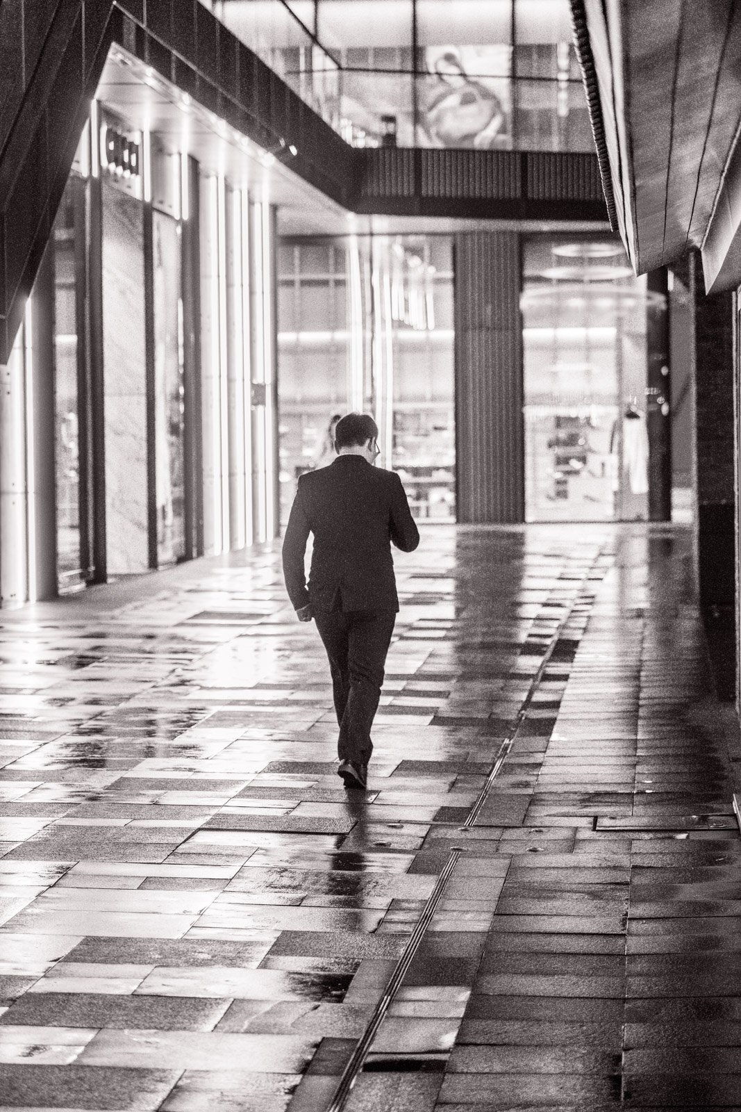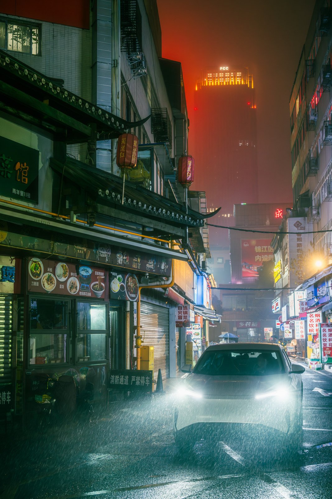 At night, Chengdu reveals another rhythm. Workers pause on ladders beneath glowing façades, maintaining the city while colorful lights pulse behind them. Businessmen walk alone along wet pavements, their reflections stretching across the ground. Narrow streets filled with signage disappear into mist, where shadows slide across rain-soaked concrete.
