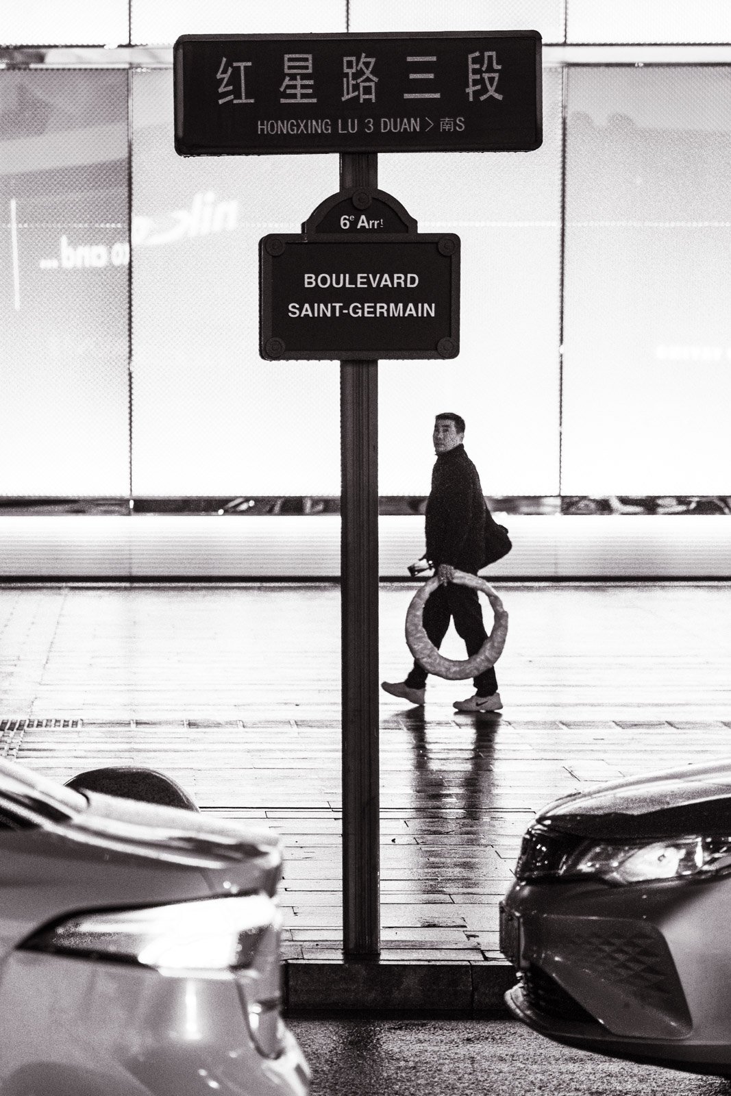 What interested me most was the contrast between movement and stillness. A man carrying a tire along Hongxing Road. A bicycle rickshaw waiting as pedestrians pass under umbrellas. Anonymous figures crossing light-filled spaces, briefly illuminated before dissolving back into the fog.